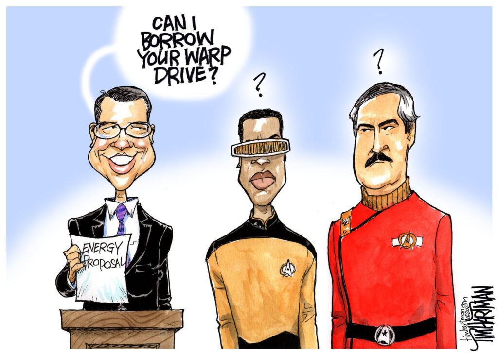“But it turns out that fusion power is … hard. Really hard. Really complicated, Full of unexpected pitfalls and traps. We’ve been trying to build fusion generators for three-quarters of a century, and we’ve made a lot of progress — enormous, groundbreaking, horizon-expanding progress. But we’re not there yet. Fusion power has been one of those things that’s been ‘only 20 years away’ for about 50 years now.”